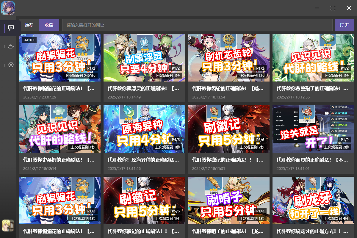 2. 收藏:收藏页面会展示用户手动收藏和自动收藏的视频。自动收藏的视频左上角会显示「AUTO」标识,且自动收藏在列表中仅保留一个。开启自动收藏功能后,关闭 Bilibili 视频窗口时会触发自动收藏逻辑,其他页面(如 B 站首页、搜索页等)不触发。手动收藏最多显示 20 条记录,自动收藏也算作一个收藏位,手动收藏对收藏页面类型无限制。