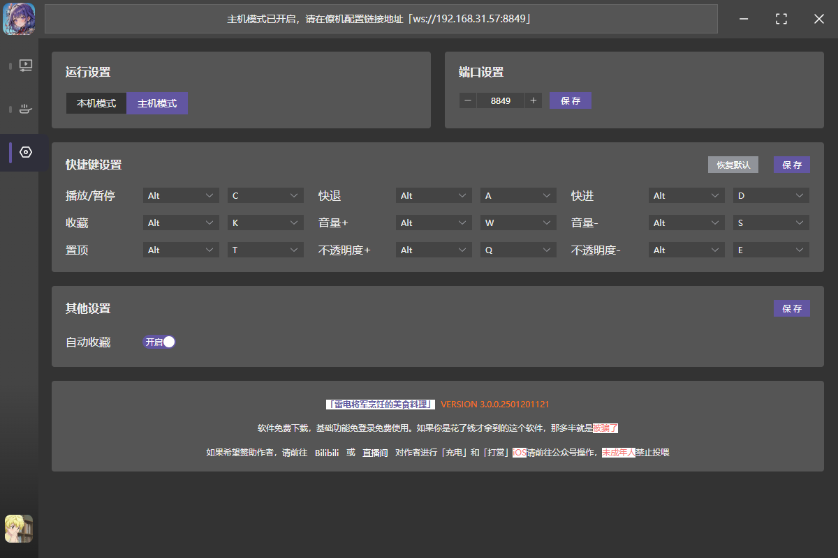 2. 主机模式:适用于多设备但主体电脑仅有一个屏幕的用户。在局域网内,主机端安装「雷电将军」,僚机端安装「八重神子」。主机端在「运行设置」中切换为「主机模式」,若有需要可在「端口设置」切换端口(默认为 8848,修改后点击保存生效)。切换成功后,软件顶部会显示主机链接地址,此时主机处于僚机未连接状态。主机端显示链接地址后,僚机端在链接地址处输入该地址并点击连接按钮。若按钮显示为「断开连接」,则表示僚机端与主机端已成功建立联系。主机端在僚机连接成功后,顶部会显示僚机的连接数量。